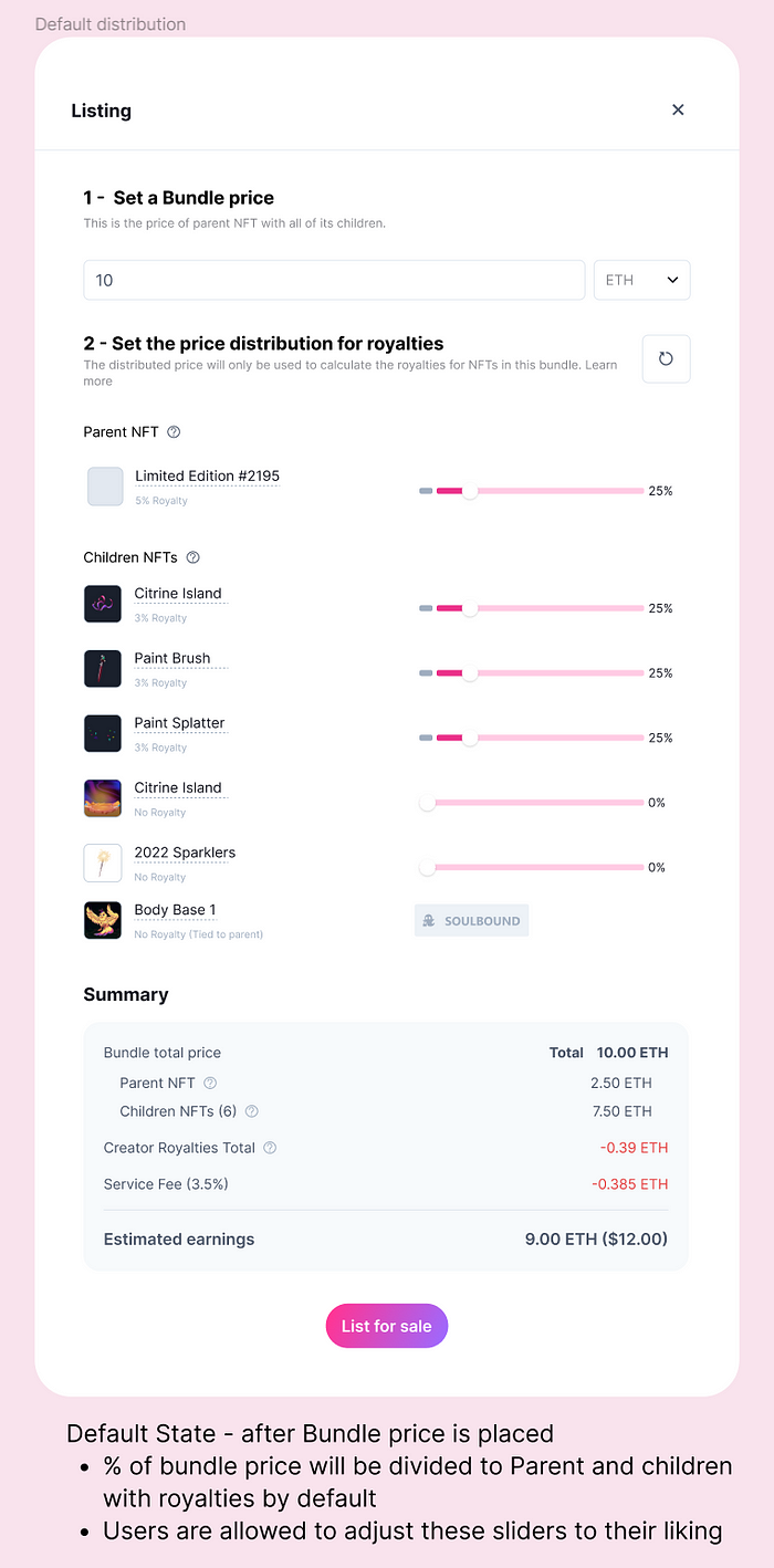 To ensure that each creator’s royalty is honored relative to the price set by the seller, RMRK’s Nested Royalty Solution requires all nested NFTs listed for sale to specify a price for each NFT in the bundle.